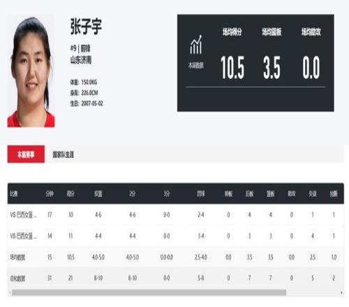 对阵巴西女篮的两场比赛,张子宇都是替补登场,第一场替补17分钟,6中4拿到10分4篮板1抢断,第二场替补登场14分钟,4中4+罚球4中4拿到11分3篮板,效率值都非常之高。