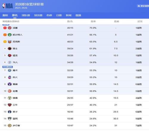 东部队伍中,活塞队一枝独秀,取得了45胜15负的战绩,领先第2的绿军5场,基本上锁定了东部第1的位置,而后面的绿军、尼克斯、骑士队,展开了第2的争夺!