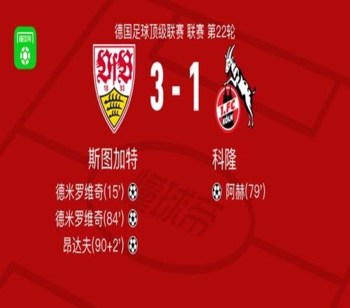 北京时间2月15日德国足球顶级联赛 联赛 第22轮,斯图加特主场对阵科隆。斯图加特德米罗维奇梅开二度,昂达夫破门。科隆阿赫破门。最终比分斯图加特 3-1 科隆。