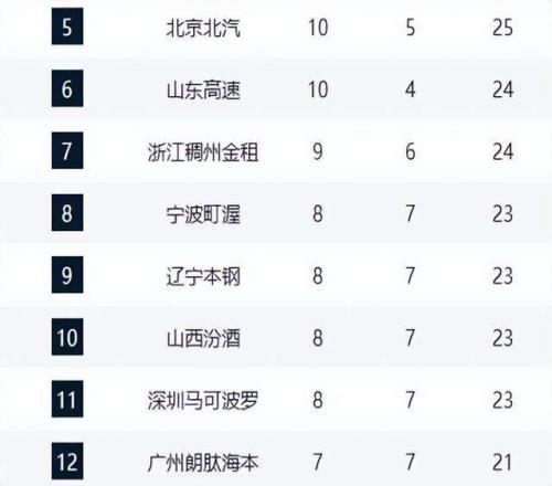 本轮焦点战役中,北京队主场迎战山西队,虽一度领先,却惨遭12分大逆转,近4战输掉3场,不过凭借小分优势仍以10胜5负的战绩位列积分榜第5名。山西队则凭借张宁复出的出色表现,客场掀翻北京队,成功拿下赛季第8胜,排名跃升至第10位,重返季后赛行列。