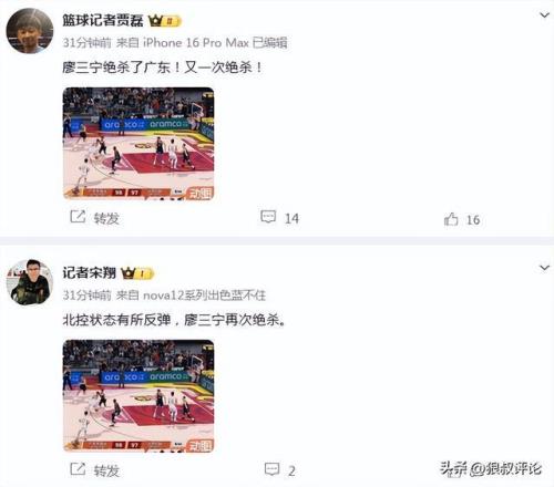 广东男篮果然每场都是五五开,主场再次遭遇压哨绝杀。今晚比分一直紧咬,萨姆纳最后一攻仓促传给徐杰,徐杰迎着对手的干扰上篮不中,廖三宁运球到前场,坚决单打徐杰,他运球碾入内线,面对萨姆纳、徐杰、胡明轩的合围,毅然一挑三压哨抛投完成绝杀。”