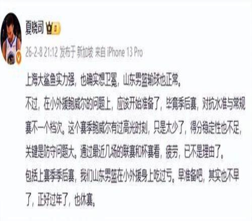 那么,山东男篮到底输在哪里了呢?赛后,山东媒体人夏晓司在社交平台给出了自己的答案。