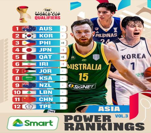 世预赛第二窗口期亚洲区实力榜:中国男篮第11,仅高于中国台北