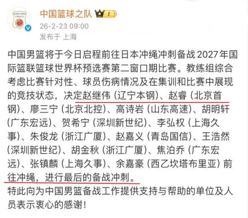 战日本!中国男篮宣布14人名单