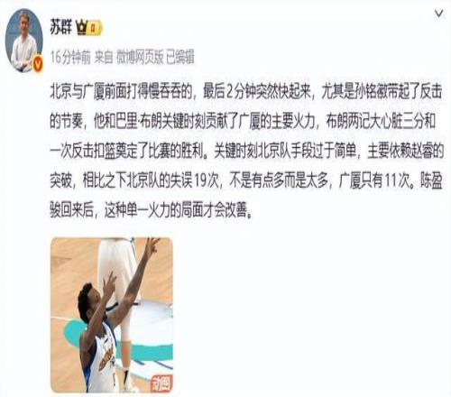苏群老师则是这样说的:北京与广厦前面打得慢吞吞的,最后2分钟突然快起来,尤其是孙铭徽带起了反击的节奏,他和巴里·布朗关键时刻贡献了广厦的主要火力,布朗两记大心脏三分和一次反击扣篮奠定了比赛的胜利。关键时刻北京队手段过于简单,主要依赖赵睿的突破,相比之下北京队的失误19次,不是有点多而是太多,广厦只有11次。陈盈骏回来后,这种单一火力的局面才会改善。