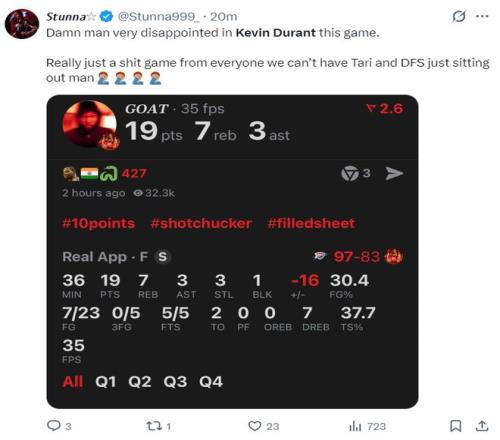 全场比赛杜兰特36分钟,23中7+三分5中0,拿19分7篮板3助攻3抢断1盖帽2失误,命中率30.4%,三分命中率0%,真实命中率37.7%(此役是杜兰特火箭生涯第二低的命中率)。杜兰特球迷都说KD表现太糟糕,火箭队太需要伊森与芬尼史密斯。
