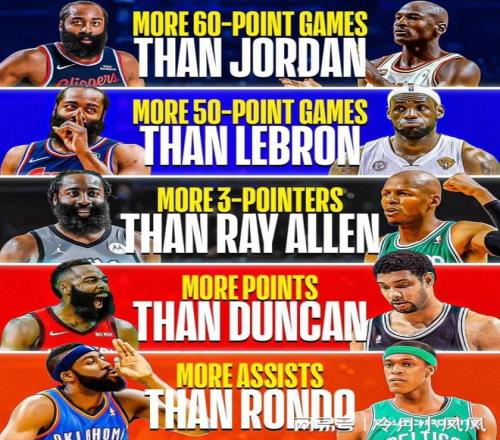 今日,美国知名体育媒体《Clutchpoins》发布了一组关于快船球星詹姆斯哈登与5位历史级球星的几项生涯数据对比。图中显示,哈登生涯60+场次(3次)多于迈克尔乔丹;哈登生涯50+场次(25次)多于勒布朗詹姆斯;哈登生涯三分命中数(3306记)多于雷阿伦;哈登生涯总得分(28780分)多于蒂姆邓肯;哈登生涯总助攻(8665次)多于拉简隆多。值得一提的是,哈登也是历史上唯一一位拿过3个得分王和2个助攻王的球员。