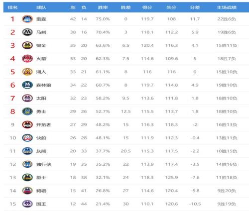 雄鹿排名东部第12,雷霆惨败给残阵雄鹿,出乎了业界预料,雷霆输球后42胜14负,继续排名西部第一,不过在全联盟的排名被活塞反超,活塞成为联盟第一,雷霆变成第二。雷霆输球给马刺送上好礼马刺只比雷霆多输2场了,这个差距并不大,马刺有希望冲击西部第一了。