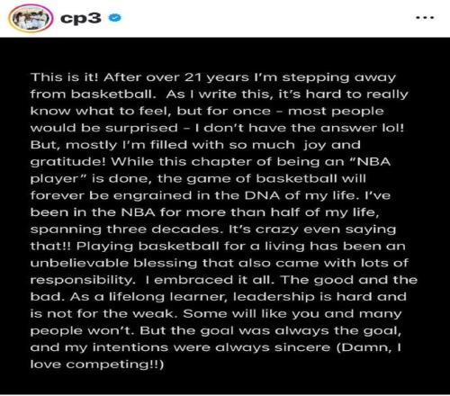 无冕之王!40岁保罗被裁后宣布退役长文深情告别21年NBA生涯