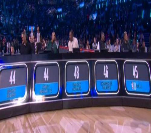 第四位登场的是湖人中锋海斯,他从后场启动后从三分线开始助跑,在罚球线以里完成一次朴实无华的暴扣,仅得到44.6分。