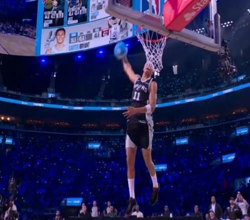 卡特-布莱恩特决赛第一扣从右侧弧顶启动,抛球到篮下加速起飞高高跃起,接反弹球完成胯下换手侧身暴扣,由于难度更高获得满分50分,也是今年扣篮大赛首个满分扣篮。