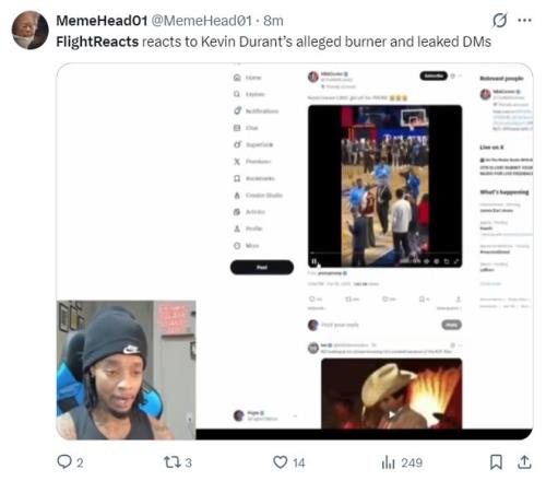 除了杜兰特疑似小号的事件,北京时间2月16日,美国网红FlightReacts还在个人社媒上吐槽杜兰特,他表示杜兰特在全明星赛前还在玩手机,他写道:KD啊,别再刷社媒了,被再用你的小号了,不要在社媒上跟别人对线了,好好打篮球吧!停止用社媒吧,专心打完这个赛季再说。