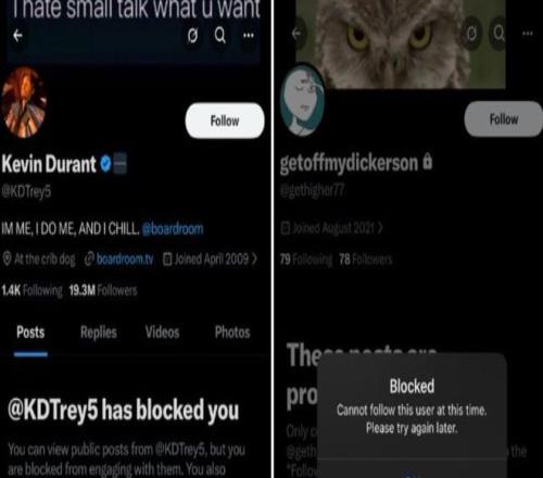 北京时间2月16日,有一位网友在社媒上爆料有一个名为‘getoffmydickerson’的账号疑似是凯文-杜兰特的小号,因为杜兰特的大号与这个getoffmydickerson账号都将他拉黑了,他就觉得这个getoffmydickerson是杜兰特小号,而这个getoffmydickerson多次语出惊人。