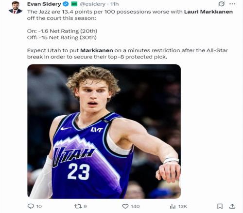因为马卡的个人发挥对球队影响过大,预计爵士队在全明星周末后会限制他的登场时间,以确保爵士队在2026年拿到前八顺位。