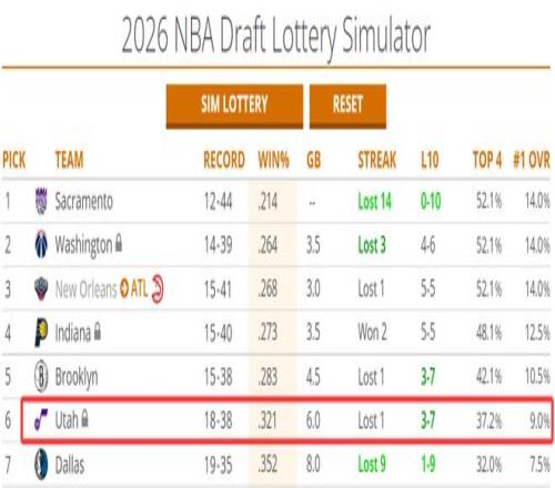目前爵士队18胜38负,状元签概率9%,前四签概率37.2%,因为这个首轮签是受保护的,爵士队必须拿到前八顺位才能自己手握所以爵士队在全明星周末后会加剧摆烂。