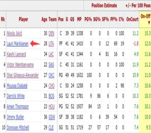 北京时间2月17日,数据媒体列出了本赛季全明星周末前联盟前十的on-off值,丹佛掘金的约基奇第一,犹他爵士的马尔卡宁第二,快船的伦纳德第三。