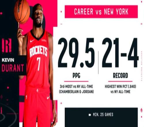 值得一提的是,杜兰特生涯面对尼克斯场均29.5分,尼克斯对手中历史第三位,仅次于张伯伦和乔丹。