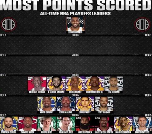第三个,詹姆斯季后赛总得分8162分。大家常说,季后赛是检验巨星成色的舞台,每一场比赛都是生死战,强度拉满,老詹能攒下这个分数,靠的是19次季后赛、280多场出场,还有场均近30分的稳定输出。现役球员中,最接近詹姆斯的球员是杜兰特,他的季后赛得分为4985分,差了快3000多分,之后的库里、哈登、伦纳德差距更多!年轻球员中,塔图姆季后赛总得分来到2936分,与詹姆斯差距5000多分,按照塔图姆的季后赛的平均数据来说,每个赛季打13.67场比赛,场均24.1分,每个赛季季后赛合计拿329分,要再拿5000多分,需要塔图姆再打16年的季后赛,且需要保证自己年年巅峰!显然,詹姆斯的这份纪录,后人只能仰望。