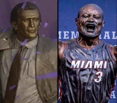 雕像的造型是莱利高举右拳,这是上世纪80年代“Showtime”时期洛杉矶湖人队的经典定格——示意“魔术师”约翰逊把球传给贾巴尔完成标志性的天勾。雕像不仅还原了西装造型,还加入了鳄鱼皮腰带等细节。