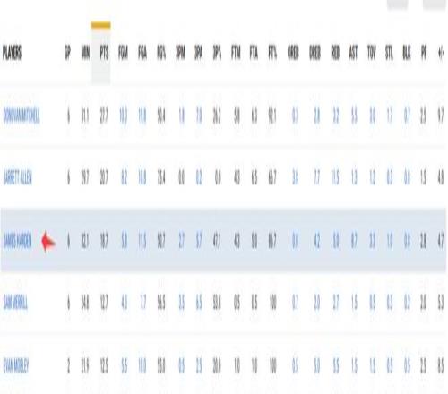 哈登加盟骑士队的6场比赛,场均32.1分钟,拿到18.7分8.7助攻5篮板1抢断0.8盖帽,命中率50.7%,三分命中率47.1%,罚球命中率86.7%,正负值+4.7。