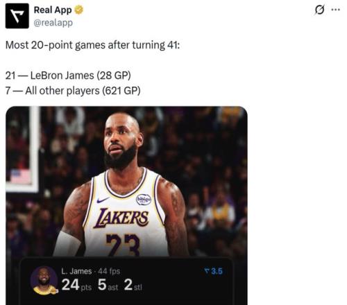 并且处于断档领先状态,联盟历史上其他球员在41岁后一共打了621场比赛仅7次拿到20+。