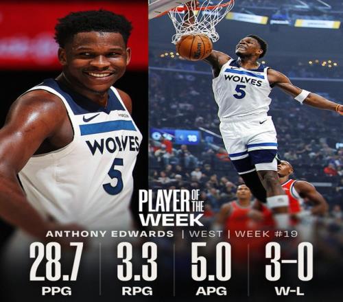 北京时间3月3日,NBA官方公布了第19周的周最佳球员,森林狼的爱德华兹当选西部周最佳球员,这是他本赛季首次当选,也是生涯第三次当选。活塞的杜伦当选东部周最佳球员,这是他生涯首次获得这一奖项。