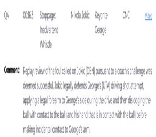 此外,在比赛结束前16.3秒,掘金队成功挑战了约基奇的防守犯规,裁判报告显示这次挑战成功无误,约基奇在防守乔治突破上篮时为合法防守,突破过程中他用前臂合理接触乔治身体侧面,随后先碰到球及持球手将球破坏,之后才偶然接触到乔治的手臂。