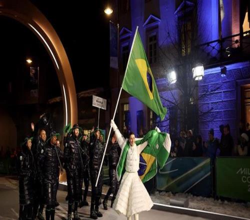 其他运动员的开幕式服装则是从巴西国旗中提取了蓝色和绿色,羽绒服加羽绒短裤或短裙,搭配帽子和 Altive 靴子。整体融合了巴西文化身份,也着重突显了 Moncler 的山地基因。