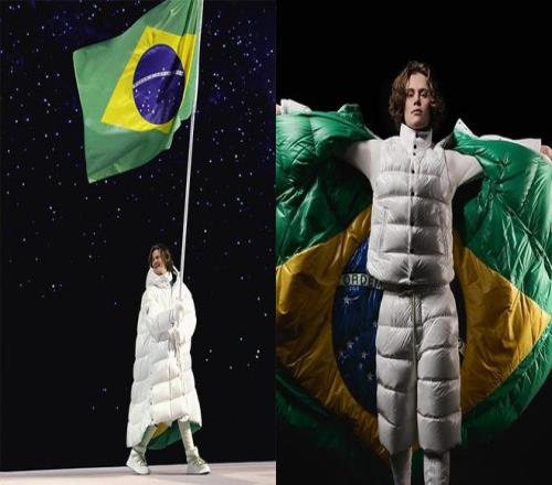 时隔近 60 年重返冬奥会的 Moncler 为巴西代表团设计了开闭幕式服装。Moncler 也专门邀请了巴西设计师 Oskar Metsavaht 共同合作,旗手的礼服以经典 Karakorum 登山夹克为蓝本,将多款羽绒服单品叠穿,核心单品是一件白色雕塑感斗篷,它的内衬镶嵌了巨幅巴西国旗,内搭羽绒背心和半身裙或裤装。