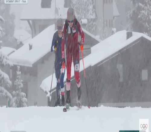 选手穿着贴皮雪板进行高强度推进。贴皮依靠纤维的各向异性摩擦特性实现“前滑顺畅、后滑受阻”。高水平选手的步频极为稳定,雪板抬离雪面的高度被控制在最低限度,以减少能量浪费,所以这个阶段运动员看起来像是在跑步或者竞走。