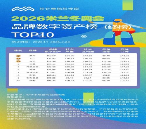 答案早已写在数据里:蒙牛,以绝对优势霸榜秒针《2026米兰冬奥品牌数字资产榜》,成为唯一在社交声量、互动量、口碑三个维度全面领跑的品牌。