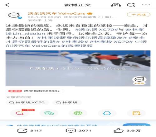 此外,平台基建之外积累的软实力,也能助品牌一臂之力。据了解,苏翊鸣的公益科普项目、林孝埈与沃尔沃的合作背后,就由平台促成。