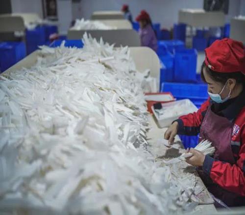 贵州省锦屏县的某羽毛球生产基地,工人在生产车间内将鹅毛挑选分类(2022年1月5日摄)。新华社记者 陶亮 摄