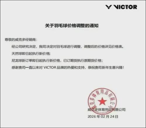 2月24日,VICTOR威克多率先宣布调价。接着斯庄格、齐克努也宣布调价,齐克努表示根据市场羽毛价格调节,公司决定对全系列羽毛球降价6元/筒。