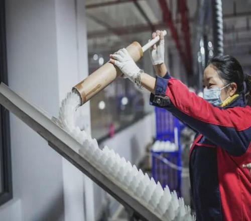 贵州省锦屏县的某羽毛球生产基地,工人将羽毛球半成品投入生产机器(2022年1月5日摄)。新华社记者 陶亮 摄
