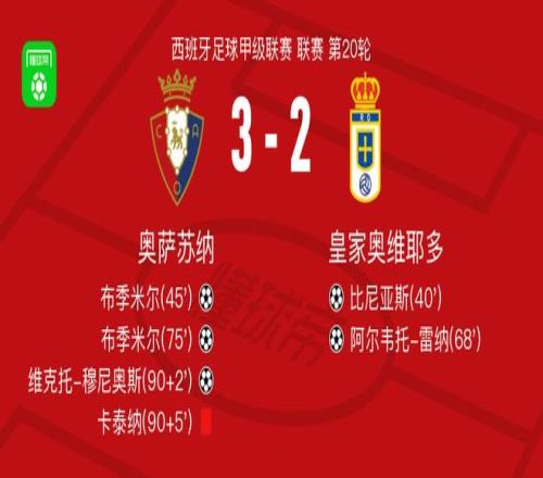 奥萨苏纳32逆转皇家奥维耶多,布季米尔梅开二度,维克托穆尼奥斯破门