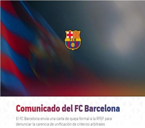 巴萨官方:已向西足协发送正式投诉信,谴责其缺乏统一的判罚标准