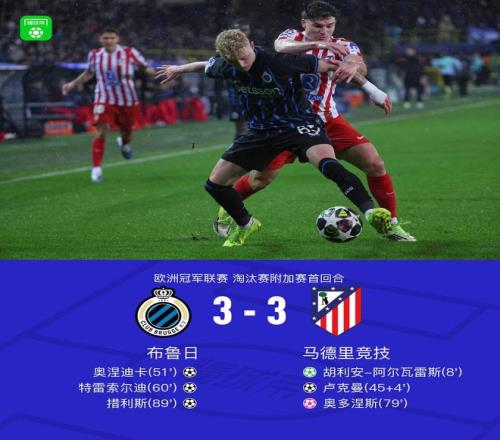 北京时间2月19日欧洲冠军联赛 淘汰赛附加赛首回合,布鲁日对阵马德里竞技。布鲁日奥涅迪卡破门,特雷索尔迪破门,措利斯破门,奥多涅斯自摆乌龙。马德里竞技胡利安-阿尔瓦雷斯破门,卢克曼破门。最终比分布鲁日 3-3 马竞。
