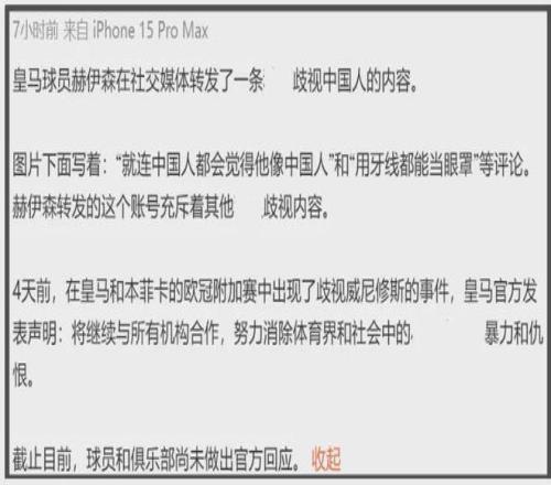 皇马官博发赫伊森道歉遭质疑:个人账号不道歉吗起码录个视频