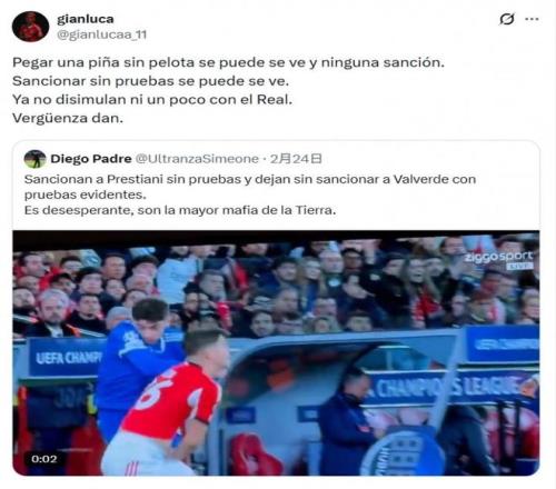 没有明确证据的情况下,直接将球员提前禁赛1场,在视频证据明确的情况下,却没有给皇马球员任何处罚,这样的判罚方式引起普雷斯蒂安尼不满也是完全可以理解的。球员直接在社交媒体上表示欧足联的判罚存在双标,皇马球员被偏袒,而且这样的偏袒不加掩饰。普雷斯蒂安尼的表态得到了不少球迷的支持,尤其是如今赫伊森辱华事件愈演愈烈的情况下,欧足联和皇马都成为了球迷心目中双标的代表。