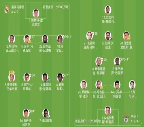 两队纸面阵容差距不小,皇马光是首发球员身价就有6.9亿欧元,本菲卡为1.89亿欧元,帕夫利季斯单箭头。穆里尼奥因红牌无缘现场指挥,在伯纳乌的包厢看比赛。