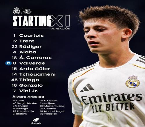皇家马德里首发:1-库尔图瓦、12-阿诺德、22-吕迪格、4-阿拉巴、18-卡雷拉斯、8-巴尔韦德、15-居莱尔、14-楚阿梅尼、45-皮塔奇、16-贡萨洛、7-维尼修斯