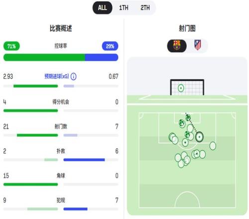 从统计数据可以看到,巴萨不但预期进球上2.93比0.67占据绝对优势,控球率也高达71%,马竞才29%。绝佳得分机会上,巴萨4比0领先,射门数21比7领先。