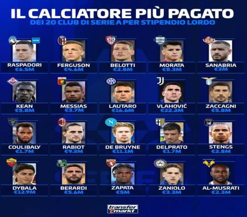 意甲20家俱乐部队内顶薪: