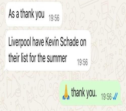 绿帽哥晒消息源聊天截图:沙德进入利物浦今夏引援名单