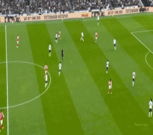 第63分钟,哲凯赖什背身做球,埃泽送出妙传,萨卡单刀射门被封堵,球打在帕利尼亚脚上反弹回来,埃泽笑纳大礼,轻松抽射得手,上演梅开二度好戏,阿森纳再下一城,3-1!本赛季两次对阵热刺,埃泽打进5球!