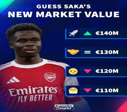 德转预热萨卡身价更新:最高涨至1.4亿欧,最低降至1.1亿