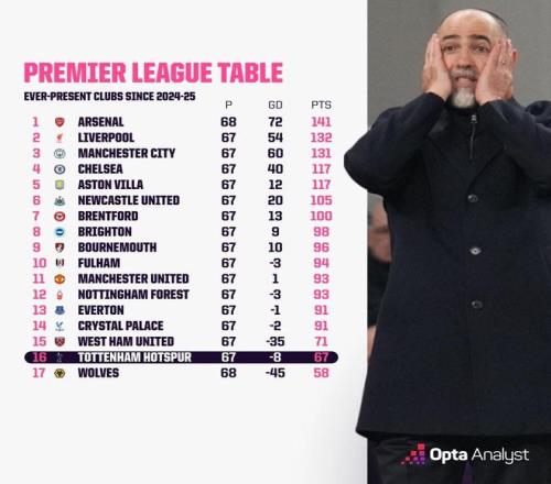 16. 托特纳姆热刺 67场 净胜球-8 67分