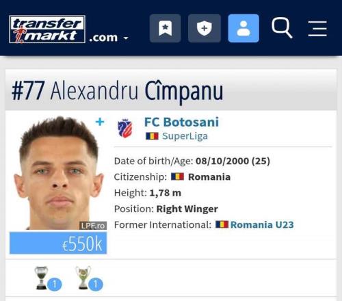 第三个,唯一花了租借费的第5名外援肯帕努,别看身价只有55万欧,但他年轻啊,只有25岁,当年在罗马尼亚U23是10号核心啊,本赛季罗甲博托沙尼19场贡献5球2助攻,是队内第二射手,绝对好用啊。