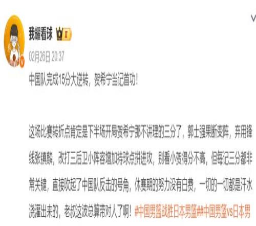 大V认为这场比赛中国队能完成15分逆转贺希宁当记首功,下半场开局贺希宁不讲理的三分让郭士强改变阵容直接弃用了锋线的张镇麟改打三后卫。